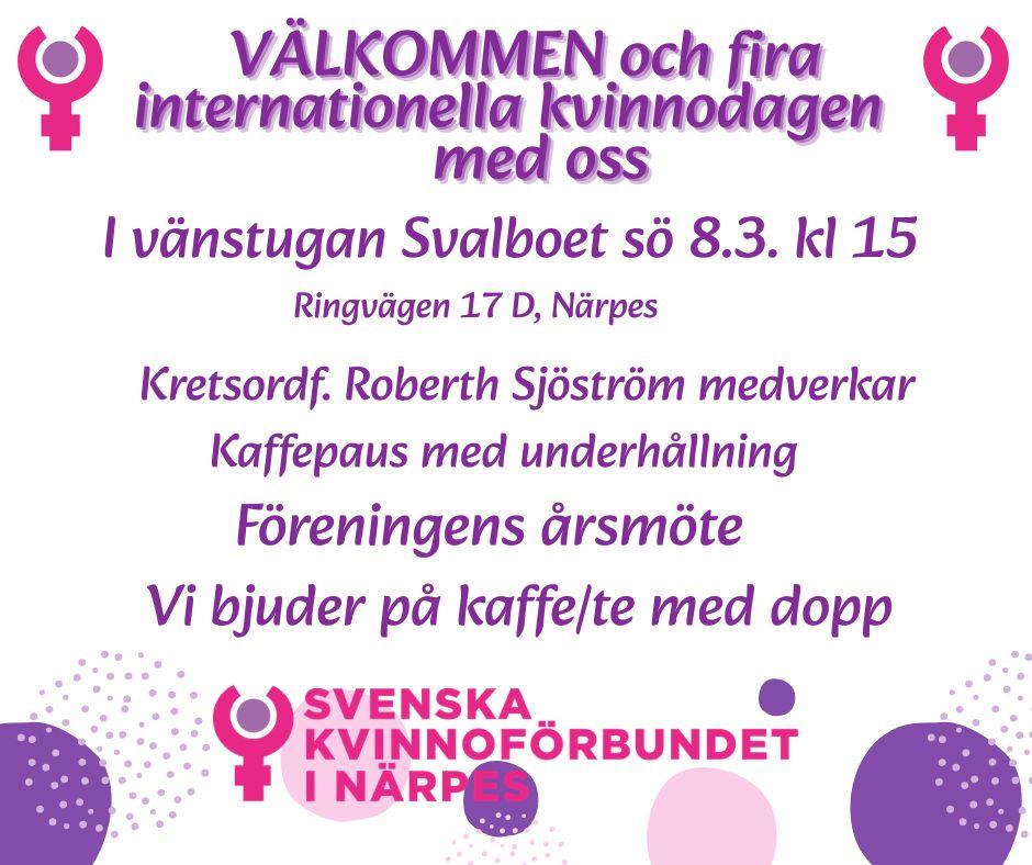 Varmt välkommen på kvinnodagen söndagen den 8.3. 2026 kl 15 till vänstugan Svalboet, Ringvägen 17D, Närpes