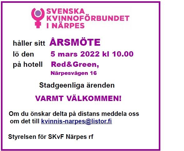Varmt VÄLKOMMEN till vårt årsmöte lördagen den 5.3. 2022 kl 10:00 i hotell Red&Green !