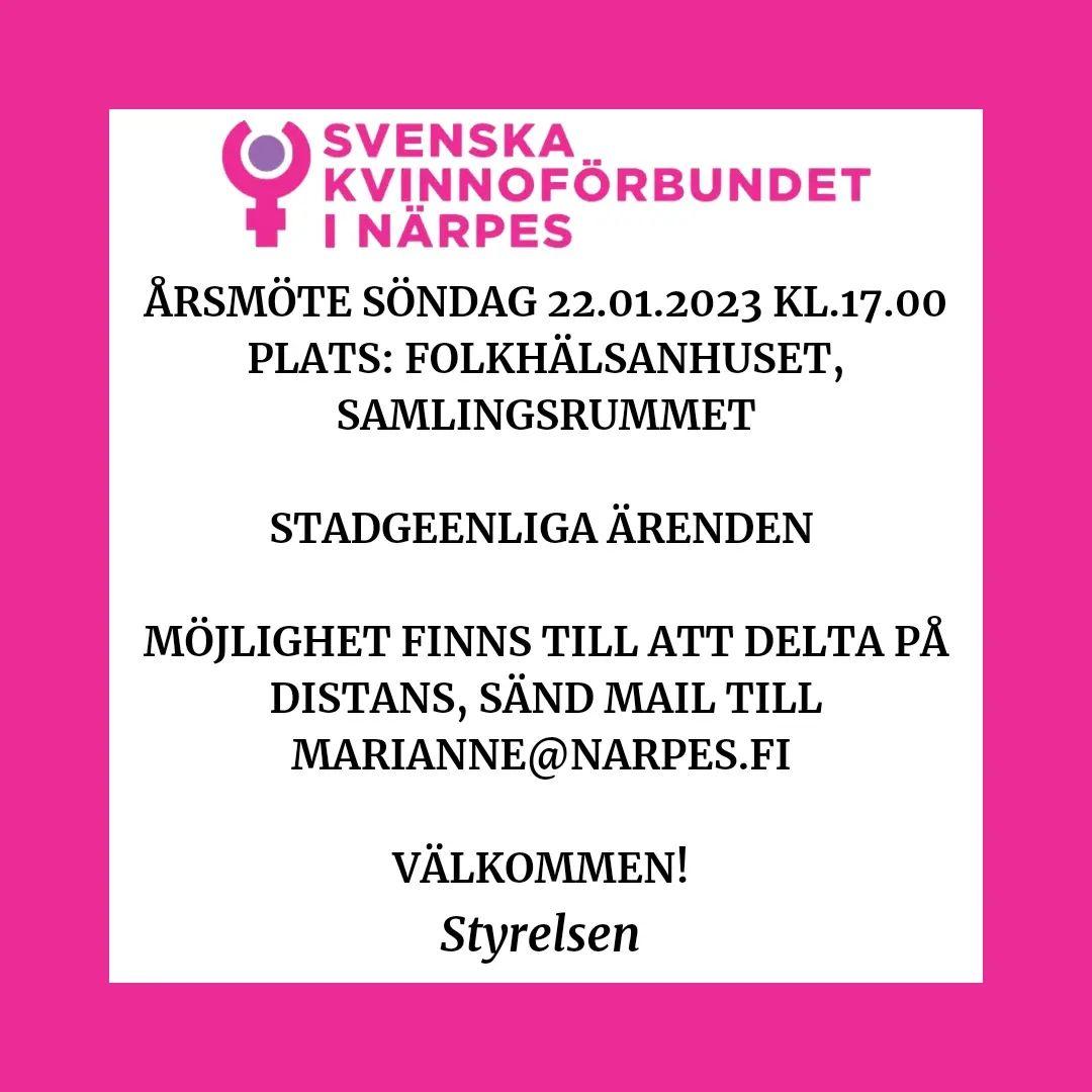 Vi inleder det nya året med inbjudan/kallelse till föreningens årsmöte söndagen den 22.1. 2023 kl.17:00 i samlingsrummet i Folkhälsanhuset på Åvägen 7 i Närpes.