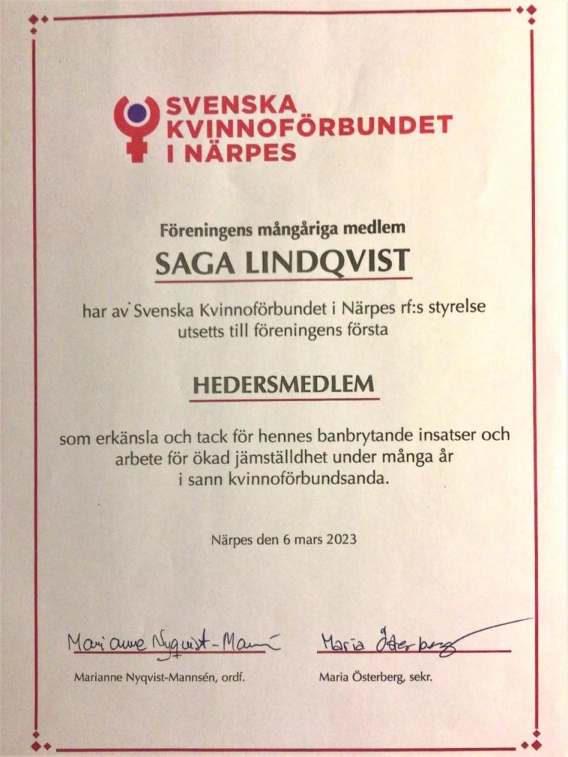 Styrelsen för Svenska Kvinnoförbundet i Närpes utsåg på sitt möte den 6.3. 2023 SAGA LINDQVIST till föreningens första hedersmedlem.