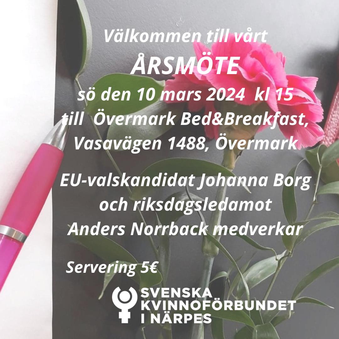Styrelsen för Svenska kvinnoförbundet i Närpes rf kallar till ÅRSMÖTE med intressant program sö den 10.3. 2024 kl 15 i Övermark Bed&Breakfast, Vasavägen 1488