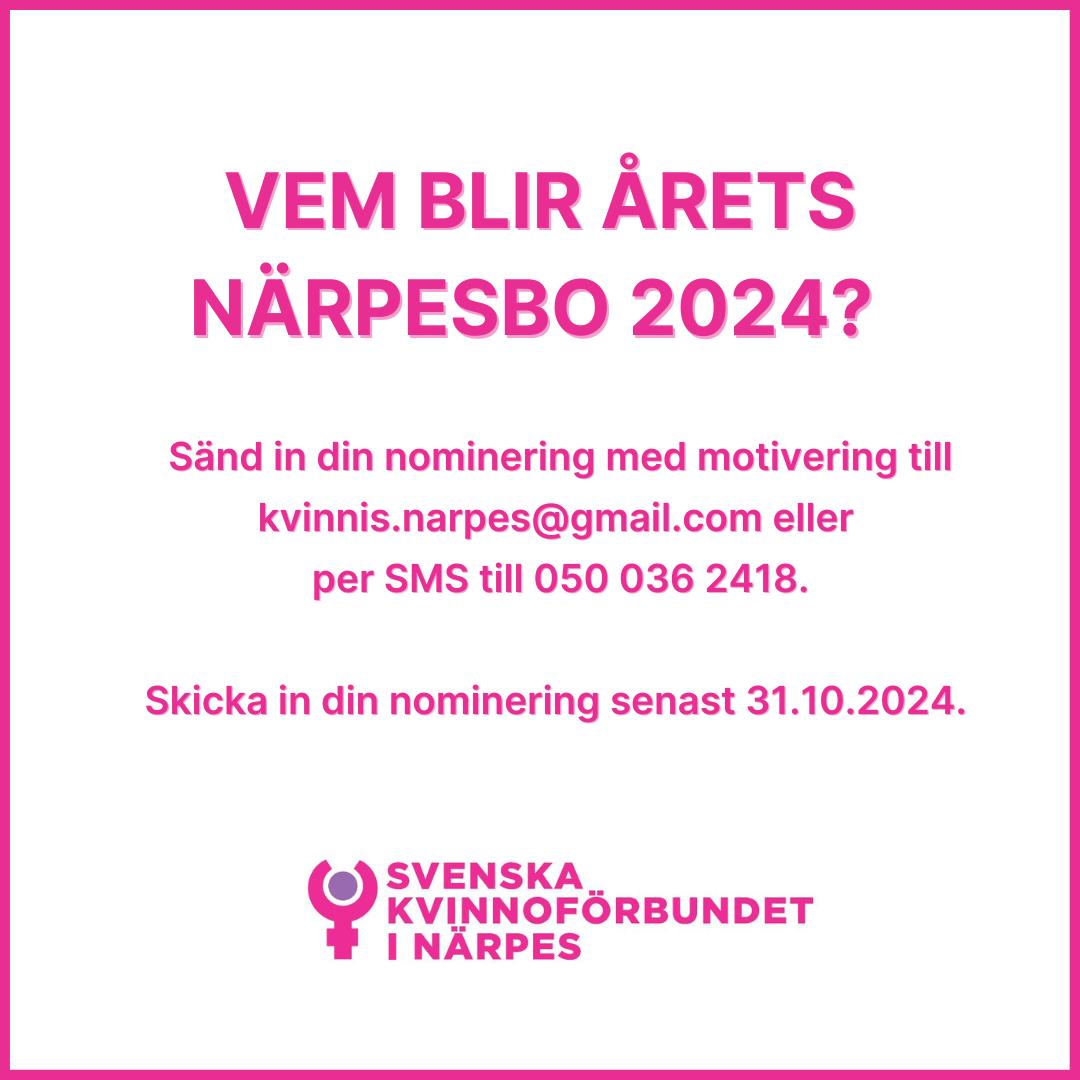 HUR NOMINERAR MAN: Välkommen och maila in ditt/dina förslag till kvinnis.narpes@gmail.com eller sänd ett textmeddelande till nummer 050 036 2418 senast den 31.10.2024