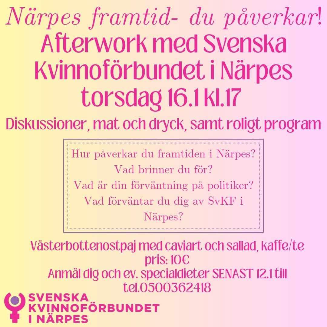 Vi inbjuder till AfterWork med SKvF Närpes med diskussioner, mat och dryck och roligt program.