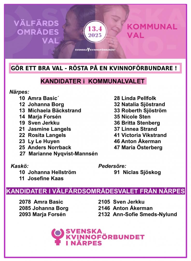 Svenska Kvinnoförbundet i Närpes har ett flertal kandidater med i vårens val för kommunfullmäktige och för välfärdsområdets fullmäktige. I kommunalvalet ställer 19 av kvinnoförbundets medlemmar upp och i välfärdsområdesvalet återfinns sex medlemmar.