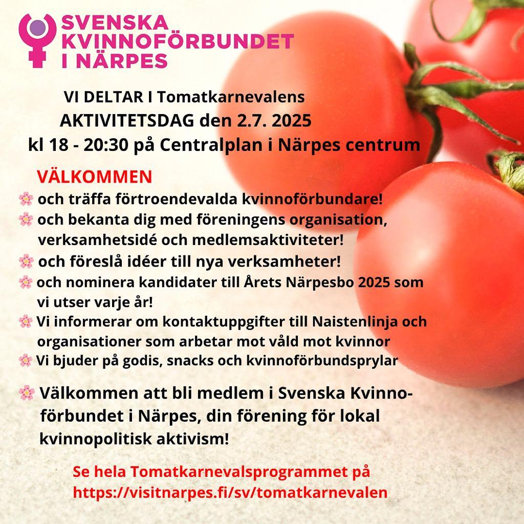 Kom och bekanta dig med vår förening på Tomatkarnevalens aktivitetsdag för föreningar som går av stapeln på Centralplan i Närpes på Mejerivägen onsdagen den 2.7. kl 18 - 20:30.