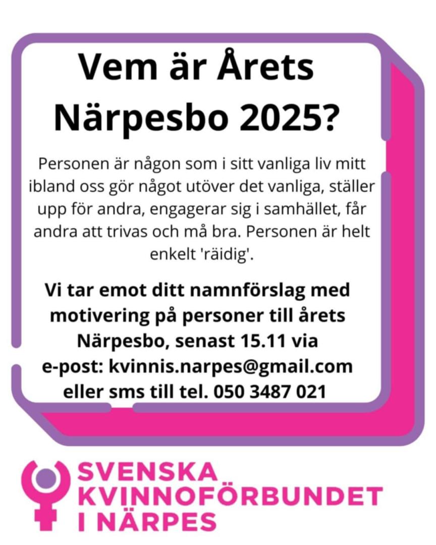 På basen av förslagen utser styrelsen för SKvF Närpes Årets Närpesbo 2025. Resultatet offentliggörs och den valda uppvaktas på en publik tillställning i december.